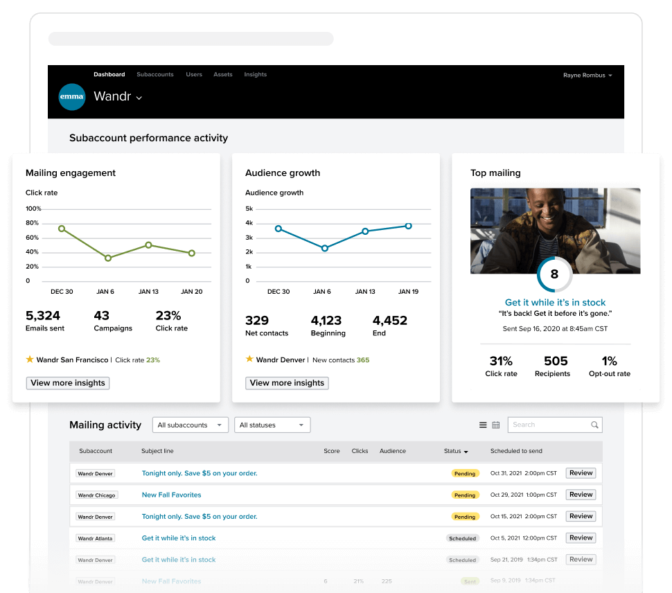 Emma’s tiered account structure allows users to have as many distinct subaccounts as they like under the main account, so various departments have their sections to send emails. Users log in and see their accounts; they cannot access anyone else’s accounts. They're just logging in and can create and draft an email and send it to their audience.